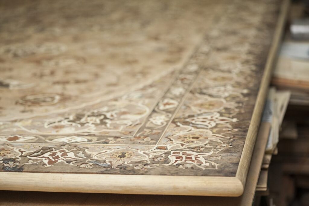 Das Design des Tisches ist ansprechend und zeichnet sich durch die Verwendung von verschiedenen Holzarten mit Teppichdesign aus. Die Kombination dieser Materialien schafft eine warme und einladende Atmosphäre, die zum Wohlfühlen einlädt.