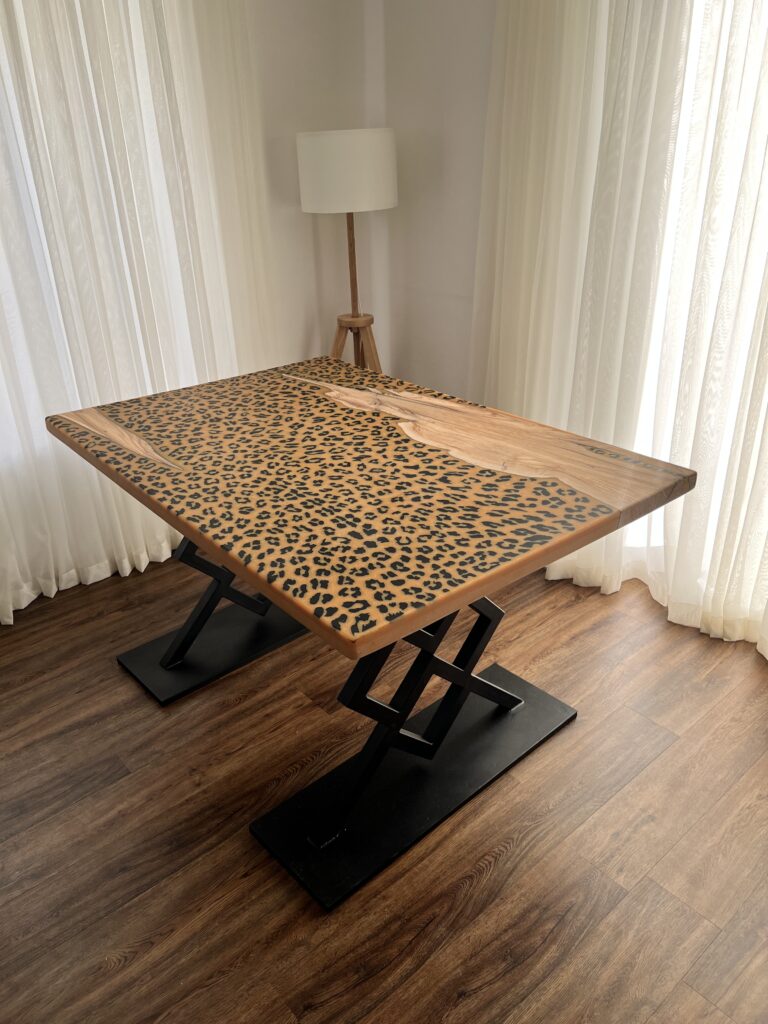 Der Tisch, den ich euch präsentiere, wurde nach monatelanger harter Arbeit vom Team von Mosu Wood fertiggestellt. Heute dürfen wir Zeugen dieses außergewöhnlichen Werkes sein. Der Tisch wurde vom Team von Mosu Wood entworfen und umgesetzt. Hergestellt aus Olivenholz und Epoxidharz, hat er die Form eines Leopardenfells.