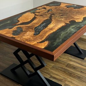 Dieser handgefertigte Tisch in den Abmessungen 176H x 103B x 6,5T cm ist ein auffälliges Möbelstück, das jeden Raum aufwertet. Ob als Esszimmertisch, Konferenztisch oder einzigartiger Arbeitsplatz, er überzeugt mit seiner modernen und erfrischenden grünen Epoxidharz-Oberfläche und passt perfekt zu einer Vielzahl von Einrichtungsstilen.